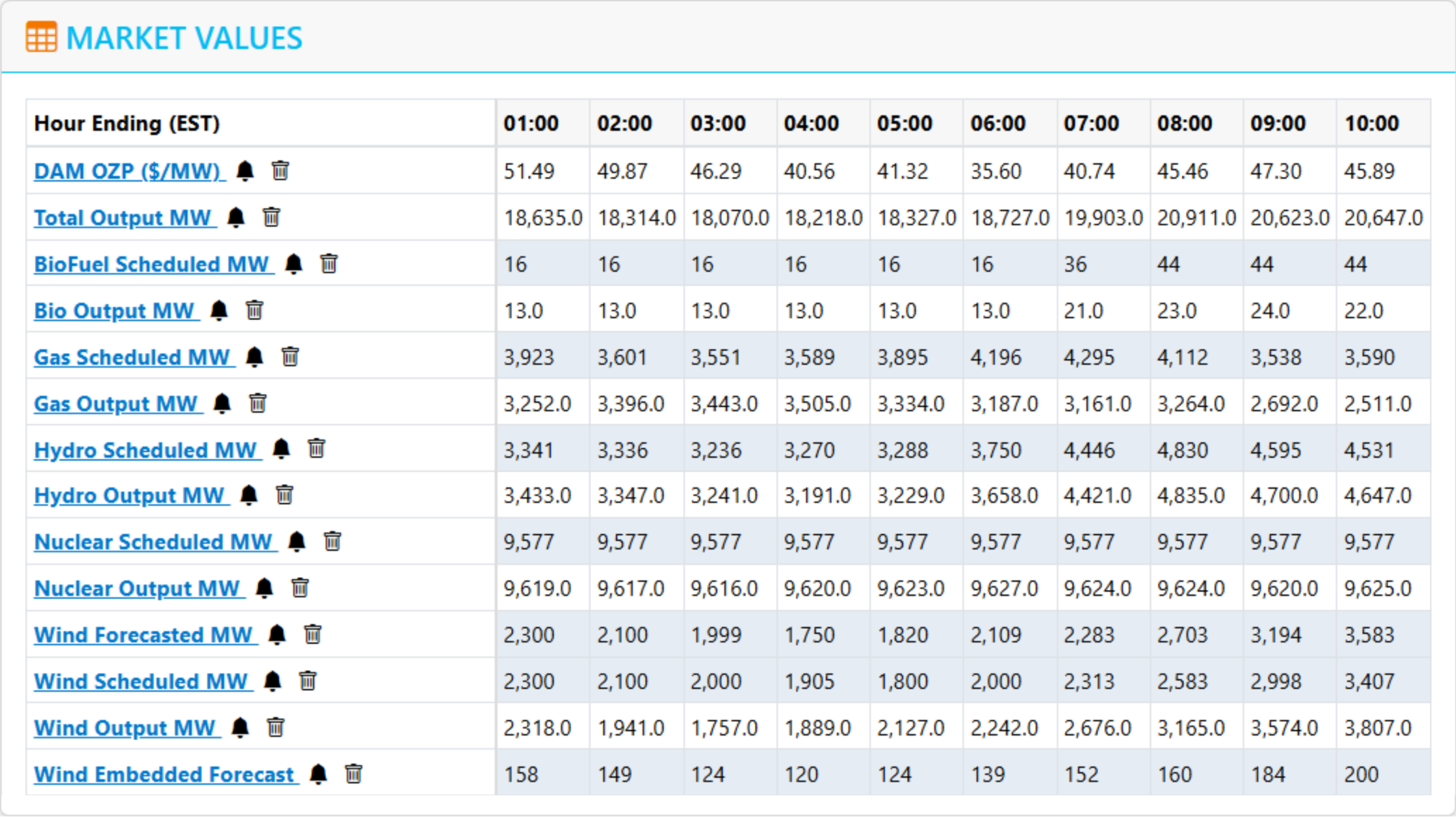 Customize your Market Values table with information that is most important to you including demand, pricing, shadow pricing, pre-dispatch schedules, supply mix, and much more. Set alerts that matter to you.